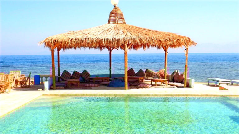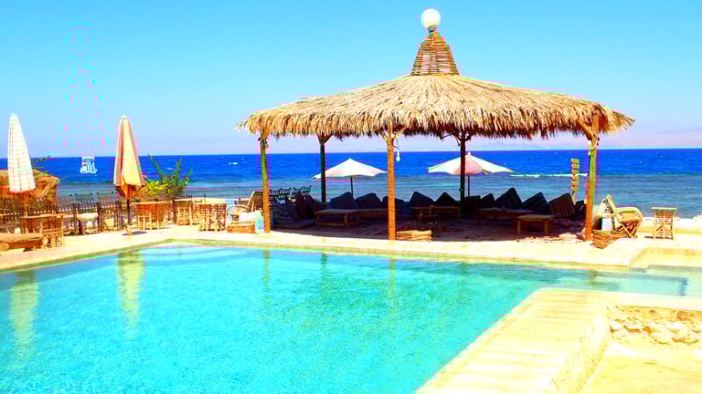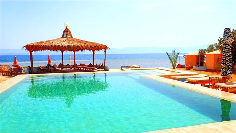Наш базен на плажи нуди прекрасан поглед на Црвено море, стварајући миран и очаравајући амбијент. Кристално чиста вода вас позива да се освежите и уживате у задивљујућем окружењу. Окружен сунцобранима и лежаљкама, наш базен је савршена оаза за опуштање.